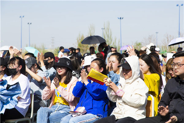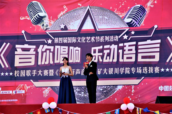 为营造我校国际教育文化氛围,加强高端化、国际化、个性化办学理念,丰富校园文化生活,4月17日下午,由国际教育学院、经济与管理学院联合全国知名音乐评说节目《中国好声音》宁夏组委会举办的学校第四届国际文化艺术节系列活动之“音你唱响 乐动语言”校园歌手大赛初赛暨《中国好声音》中矿大银川学院海选专场选拔赛在学校运动场隆重举行。国家一级演员、宁夏著名女高音歌唱家赵云台、宁夏演出行业协会常务副会长、宁夏音协流行音乐学会秘书长孙继东、《中国好声音》宁夏赛区组委会会长、宁夏华宇星空文化传媒有限公司董事长刘蜜珊为海选评委出席。同时到场的嘉宾有招商银行银川兴庆府支行行长张涛、学校国际教育学院院长张康龙、宣传部副部长张弘德、经济与管理学院党总支书记、副院长杨欣欣及各学院团总支书记、老师、学生近一千人共同观看本场比赛。