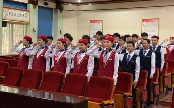 在庄严的国歌奏唱之后,各位领导嘉宾为2019年春季新生进行了服装授予,学生接过制服,踏入了人生的新阶段。之后2019年春季全体新生进行了庄严宣誓:“刻苦学习,全面发展。相信自我,不断超越!追求卓越!抬头,挺胸,我自信!流血,流汗,我成功!”同学们坚定了航空服务工作信念,牢记“我是民航人”的信条,践行民航精神,严谨锤炼,时刻做好为民航事业贡献自己力量的准备。